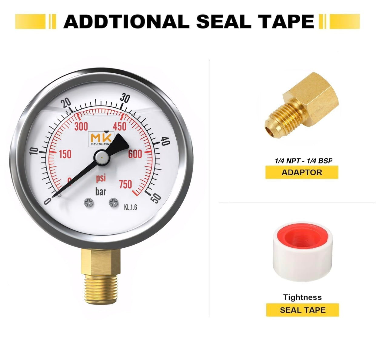 Manomètre glycérine 0-50 bar connexion 1/4 NPT, boîtier en acier inoxydable avec teflon et adaptateur 1/4 NPT vers 1/4 BSP pour testeur de compression, pression air, huile, pneu, eau, gaz et essence